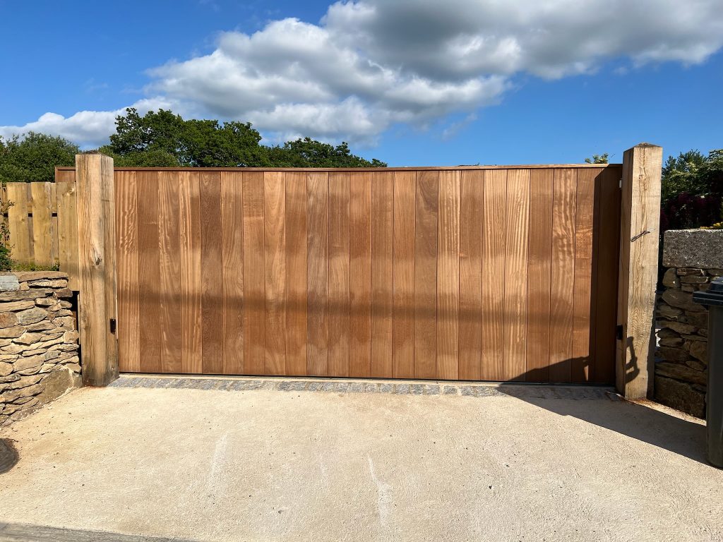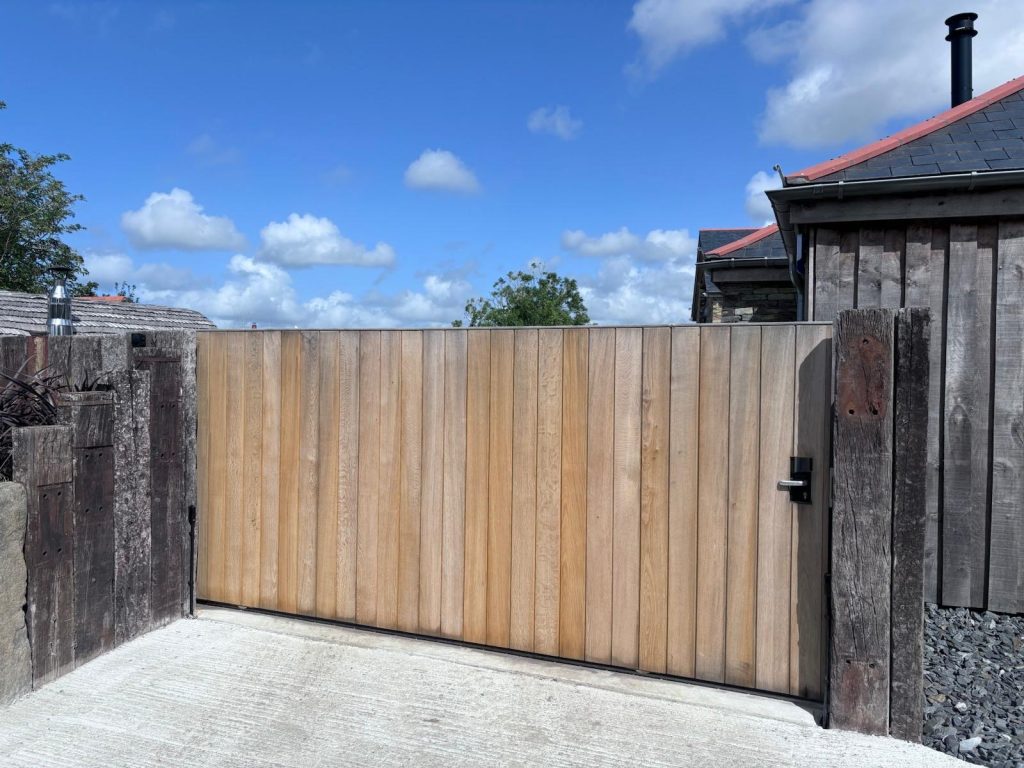 Smaller gates, up to 3000mm wide can normally be made as one gate with no internal steel frame work. For the bigger gates we normally make a box section steel frame and then clad on one or both sides with timber. You can specify either hard or soft timber.