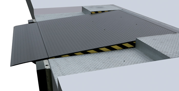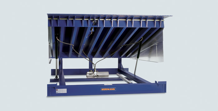 Hydraulic dock levellers are available as hinged lip or telescopic dock levellers. With a length of up to 5 metres, they can bridge large height differences between the ramp and the lorry loading level. Up to a size of 2000 × 3000 mm, the dock leveller platform is made of a single piece. Longer dock levellers are connected by a stable, continuous weld seam. All Hörmann dock levellers comply with the requirements of EN 1398.